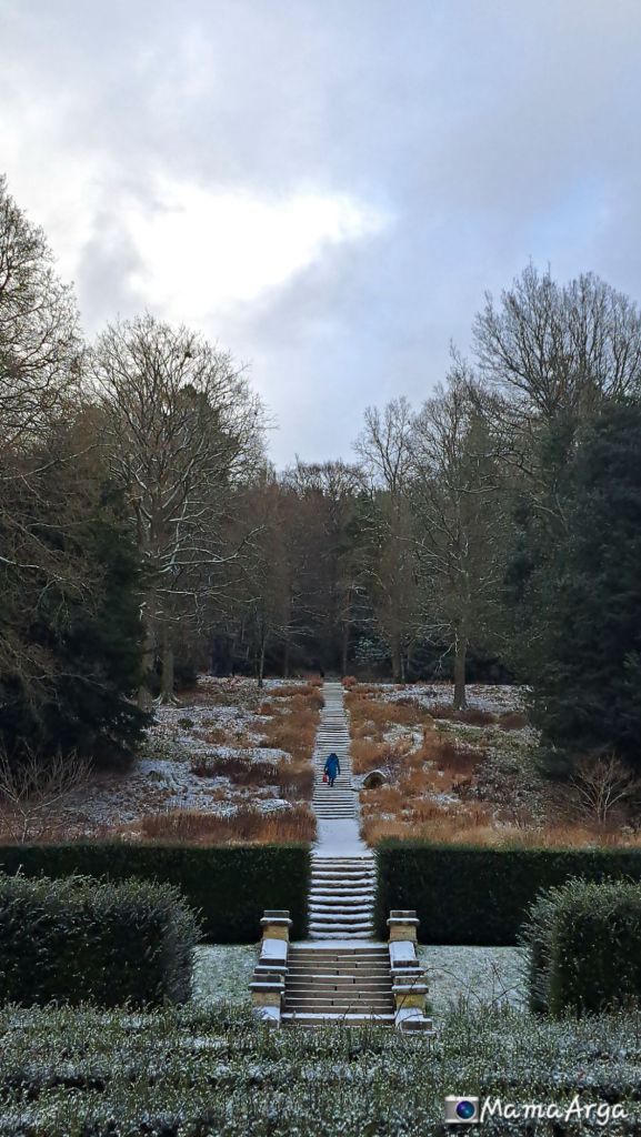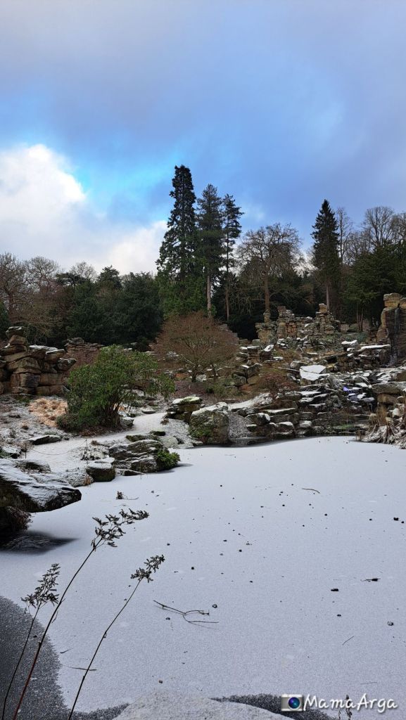 Bagian paling magis dari hari itu adalah saat kami menyusuri Chatsworth Garden yang sudah memutih karena salju yang baru saja turun. Kami sempat lihat fountain, main di area maze, dan lanjut jalan santai melewati waterfall kecil yang tersembunyi. Rasanya damai banget, seperti masuk ke dunia dongeng.