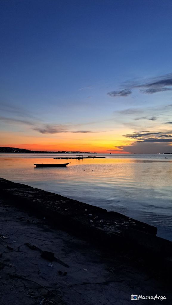 Selain tiga tempat tadi, ada satu tempat sederhana buatku dan Arga menikmati senja. Cukup berjalan kaki, tak sampai 10 menit dari tempat tinggal kami, ada area perairan laut tempat di mana warga sekitar sering berenang atau memancing di sore hari. Suasana langit senjanya tak kalah indah lho.