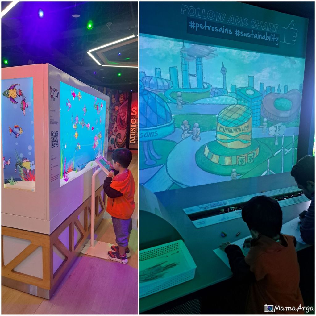 Beberapa wahana interaktif yang Arga coba, happy banget liat ikan dan gambar buatannya muncul di layar