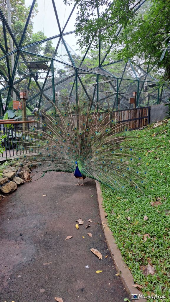 Pertama, kami mengunjungi Taman Burung. Area ini sangat luas dan rindang, burung-burung dibiarkan terbang bebas dalam kandang kubah raksasa. Arga senang sekali bisa melihat berbagai jenis burung dari seluruh Indonesia, apalagi pas lihat burung merak yang lagi memamerkan bulunya. Setelah puas berkeliling di dalam kubah raksasa, ada playground di bagian luar yang seru buat Arga bermain.