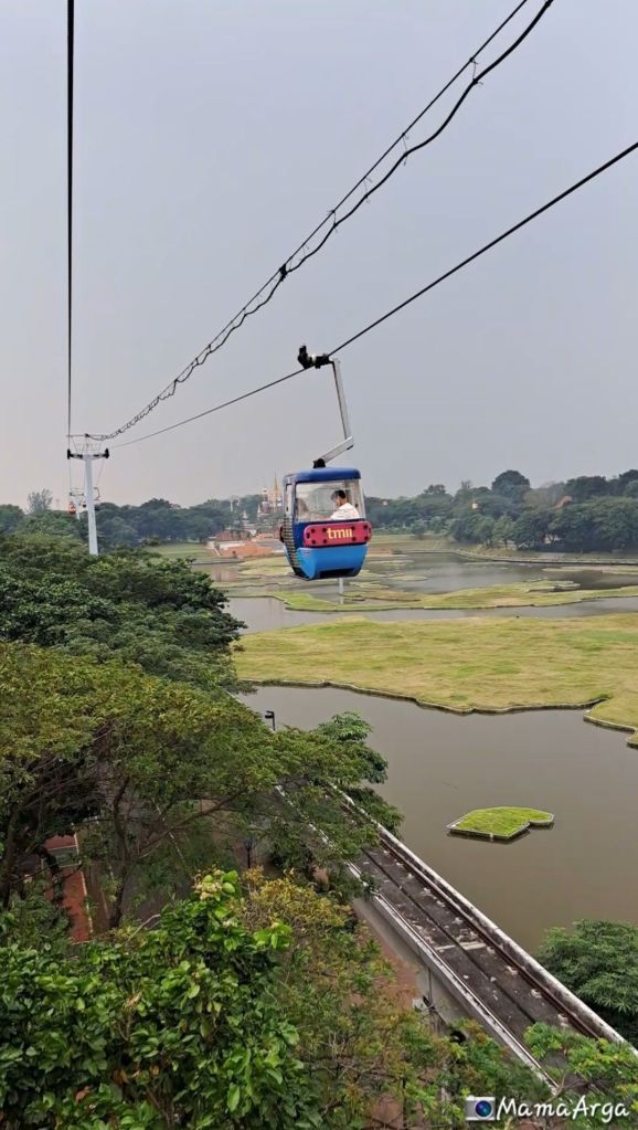 Masih belum puas menjelajah TMII, akhirnya kami mencoba naik kereta gantung. Dengan biaya Rp 25.000/orang kami bisa melihat hamparan anjungan daerah TMII dan lanskap sekitarnya—pengalaman yang menyenangkan untuk menutup hari.