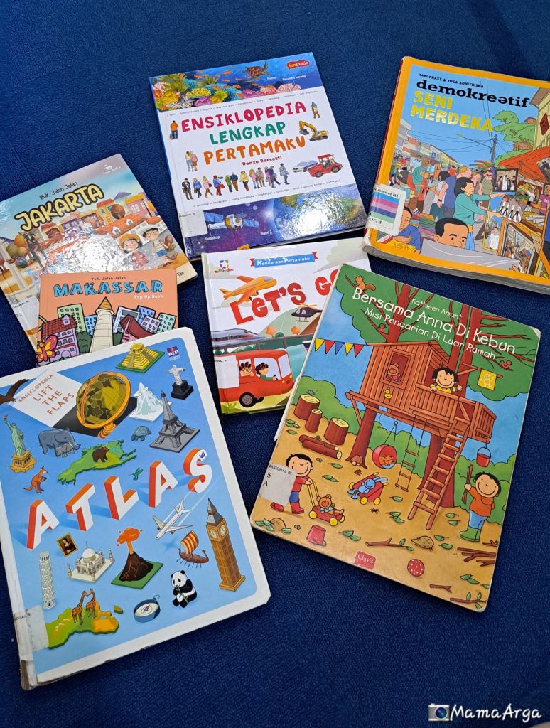 Sebagian dari buku-buku seru yang dibaca Arga waktu di Perpusnas, favoritnya tentu saja buku yang gambarnya bisa pop-up