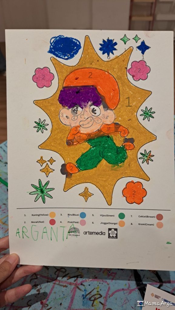Sebelum masuk ke area pameran, petugas akan menjelaskan peraturan, apa yang boleh dan tidak boleh dilakukan selama berada di ruang galeri. Pertama kami masuk ke ruang pameran tetap Galeri Nasional yang menampilkan koleksi seni rupa Indonesia dari masa ke masa. Meski tidak semuanya bisa dipahami anak-anak, tapi ini jadi momen bagus buat mengenalkan bentuk ekspresi seni yang lebih luas. Terdapat Ruang Aktivitas Anak dan Keluarga di bagian akhir pameran tetap. Di sana Arga mewarnai gambar dan boleh memilih hasilnya akan dibawa pulang atau dipajang di dinding.