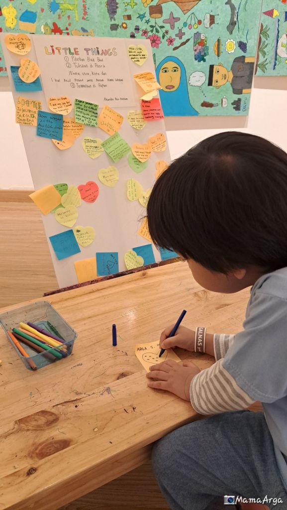 Arga menulis dan menggambar di post-it untuk ditempel di pameran Kids Bienalle 2025