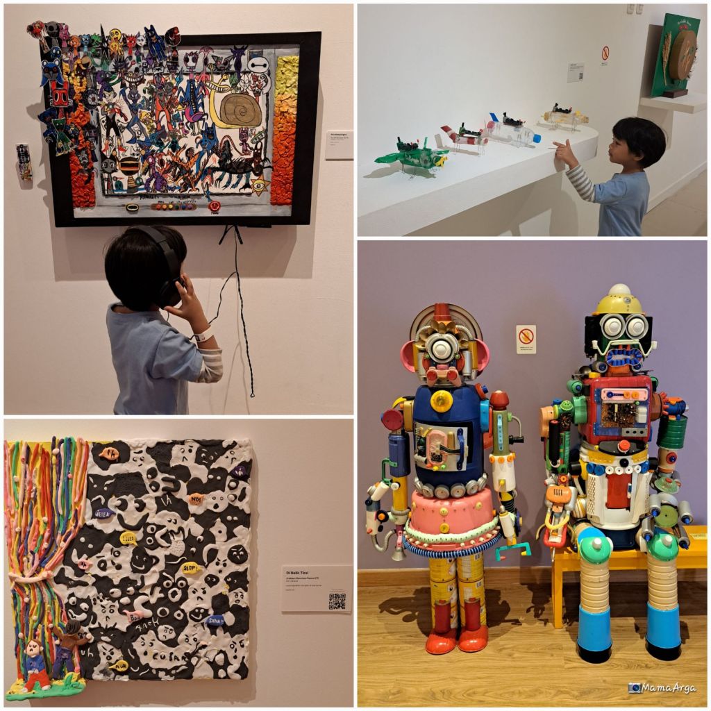 Begitu masuk, Arga langsung excited melihat instalasi seni yang berwarna-warni. Ada yang berupa lukisan, patung, hingga karya interaktif yang bisa disentuh dan dimainkan. Yang paling seru, ada satu ruang pameran yang dibuat seperti dunia imajinasi anak-anak, lengkap dengan suara, cahaya, dan tekstur unik. Arga sempat betah cukup lama di situ.