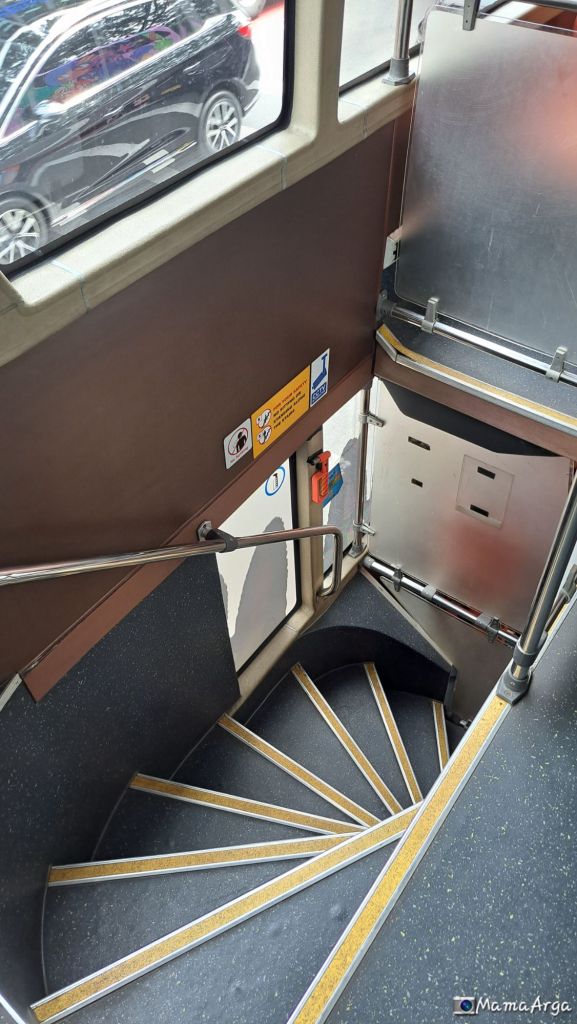 Tangga ke lantai atas bus tingkat yang sedikit curam untuk anak-anak. Jadi hati-hati yaa..