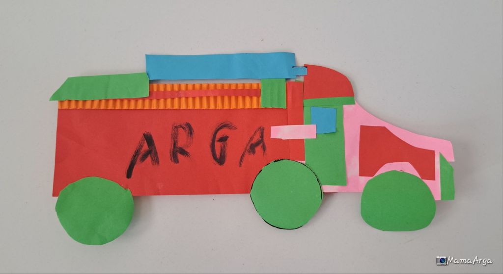 Salah satu karya favorit Arga—mobil hasil potong dan tempel kertas origami. Warna, bentuk, dan susunannya mencerminkan kesabaran dan detail yang ia perhatikan. Menariknya, ia menggunting asal tanpa menggambar polanya dulu, tapi hasilnya keren banget.