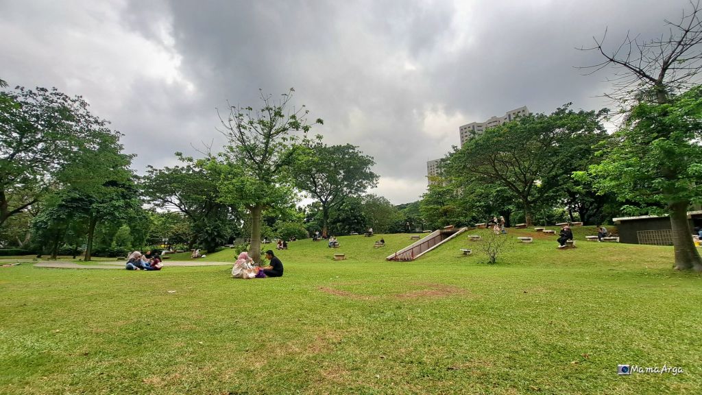Sore itu, meski langit sudah mendung gelap dan akan segera turun hujan, tapi ada banyak sekali pengunjung Hutan Kota GBK selain kami. Ada yang datang bersama keluarga, dengan teman, dengan pacarnya, dan ada juga komunitas yang sedang gathering di sana.